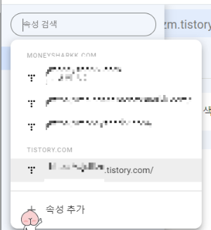 | 로그인 후 화면 왼쪽 상단 기본메뉴를 눌러 주시고 상단 사이트 주소가 나오는 곳 왼쪽 화살표를 눌러주시면 작은 장에 하나 나오고 하단에 속성추가를 눌러주세요. | ![]() |
