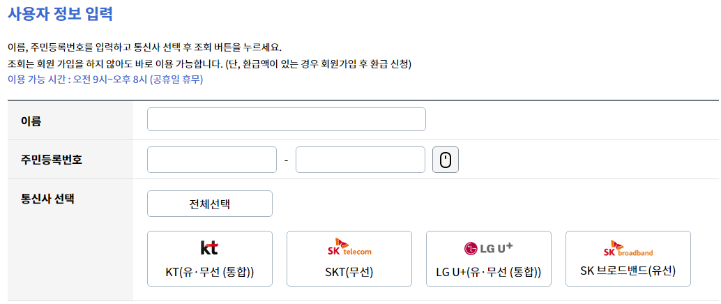 통신 미환급액 조회하기